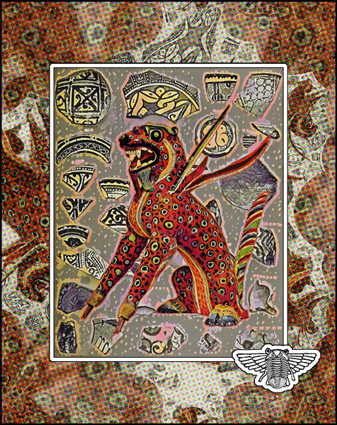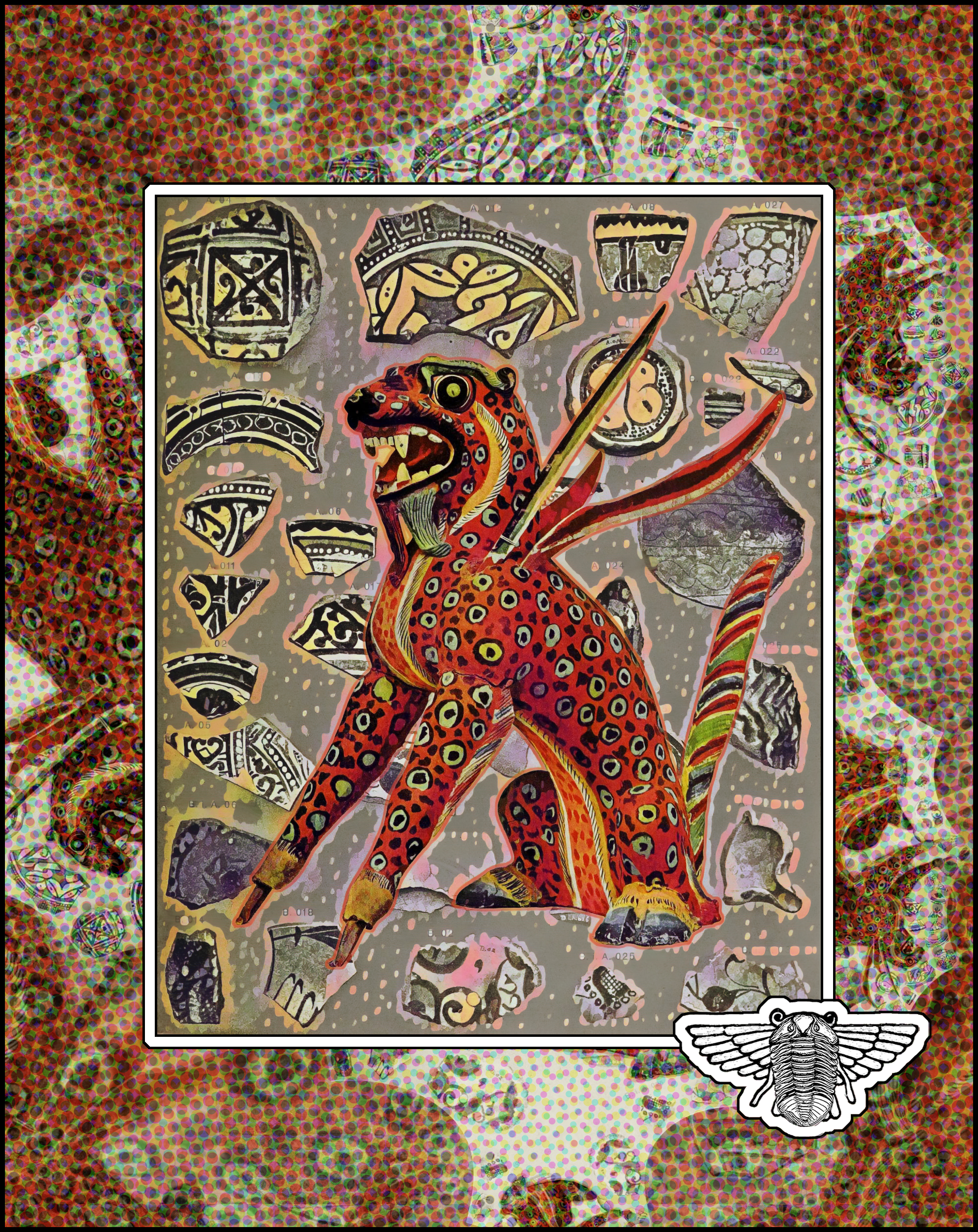 A painted monster sculpture -- presumably a child's toy -- on a background based on the toy's colorful patterns and shards of pottery.