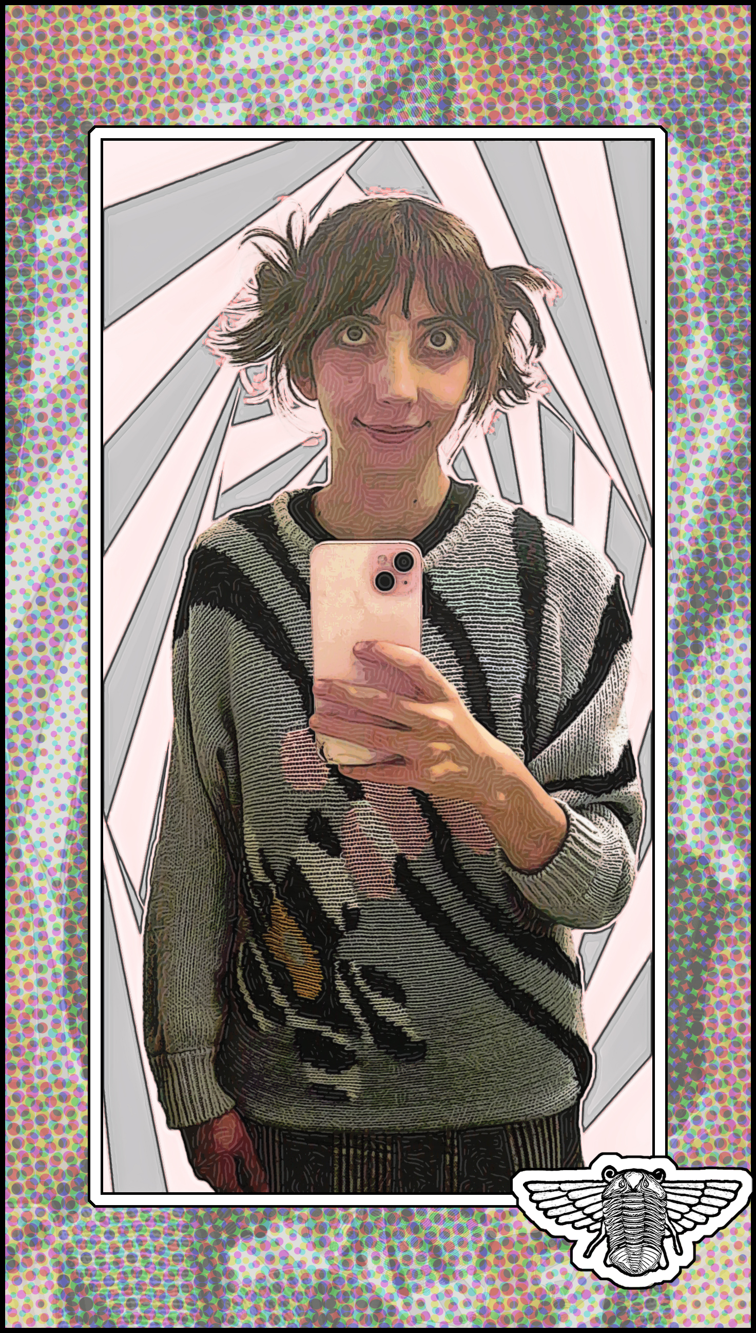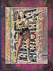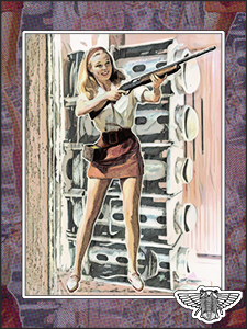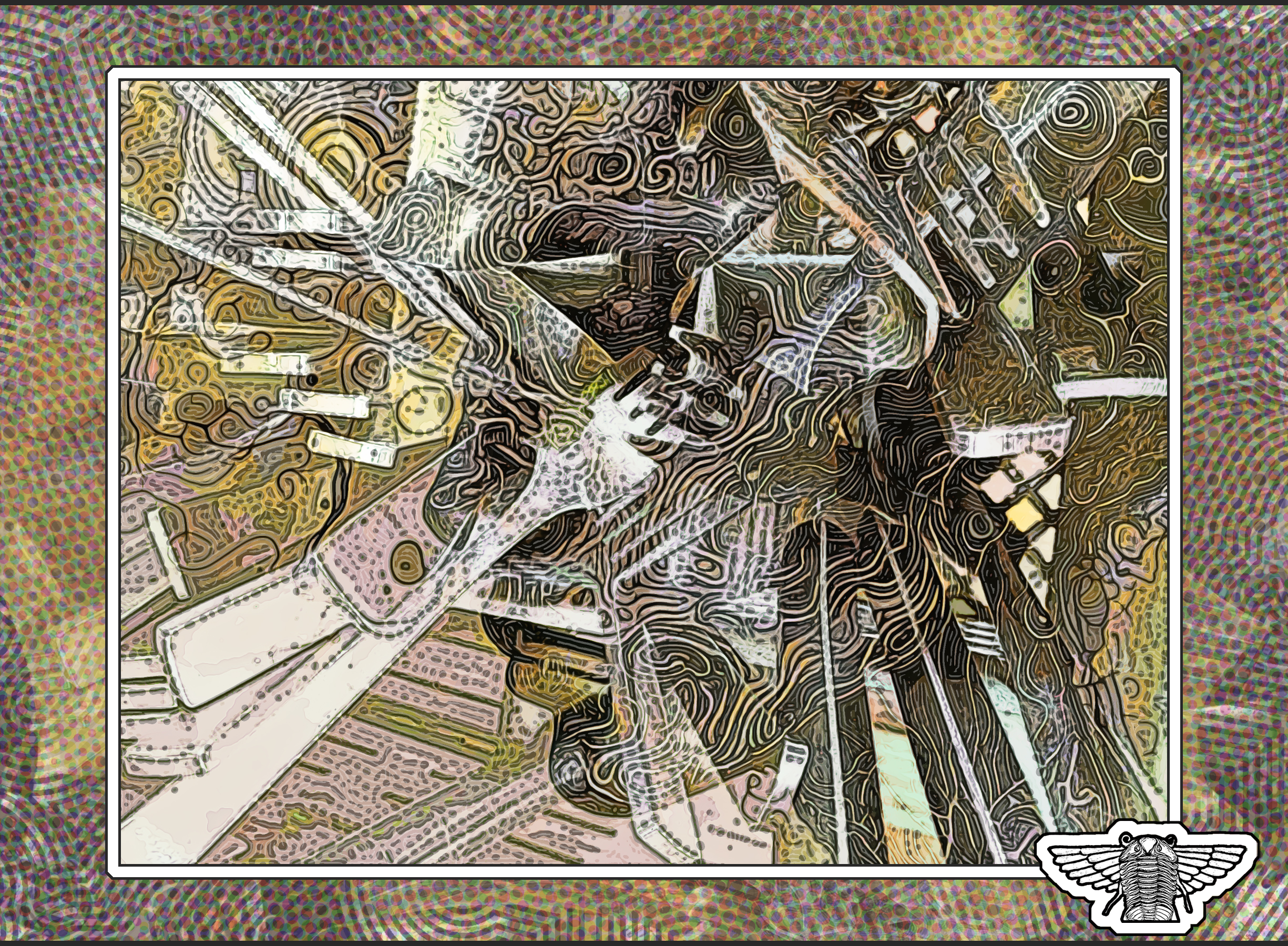 From a 70's nostalgia site, a teenage girl at a skeet shooting range (Link1) overlaid on a photograph of an old conductor's belt-style changer holder (Link2). The whole goes through my usual distortion and composition procedure (Link3), and then, finally, a touch of NEURALSTYLE.ART transfer, style GRAFFITI (Link4).