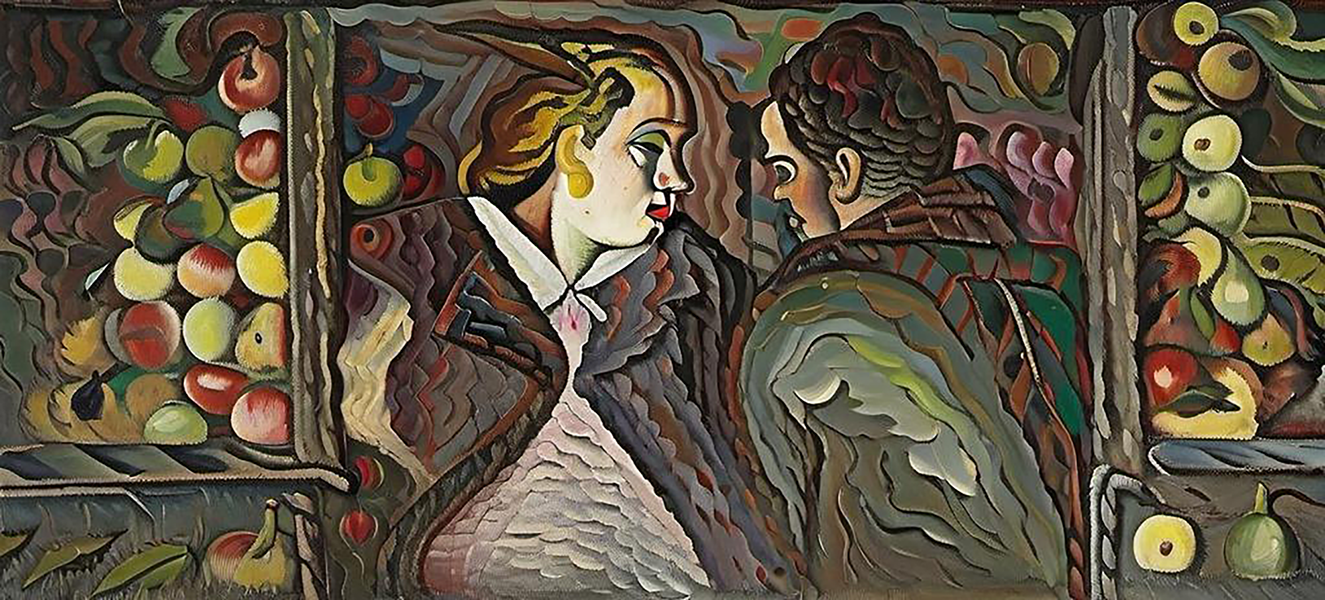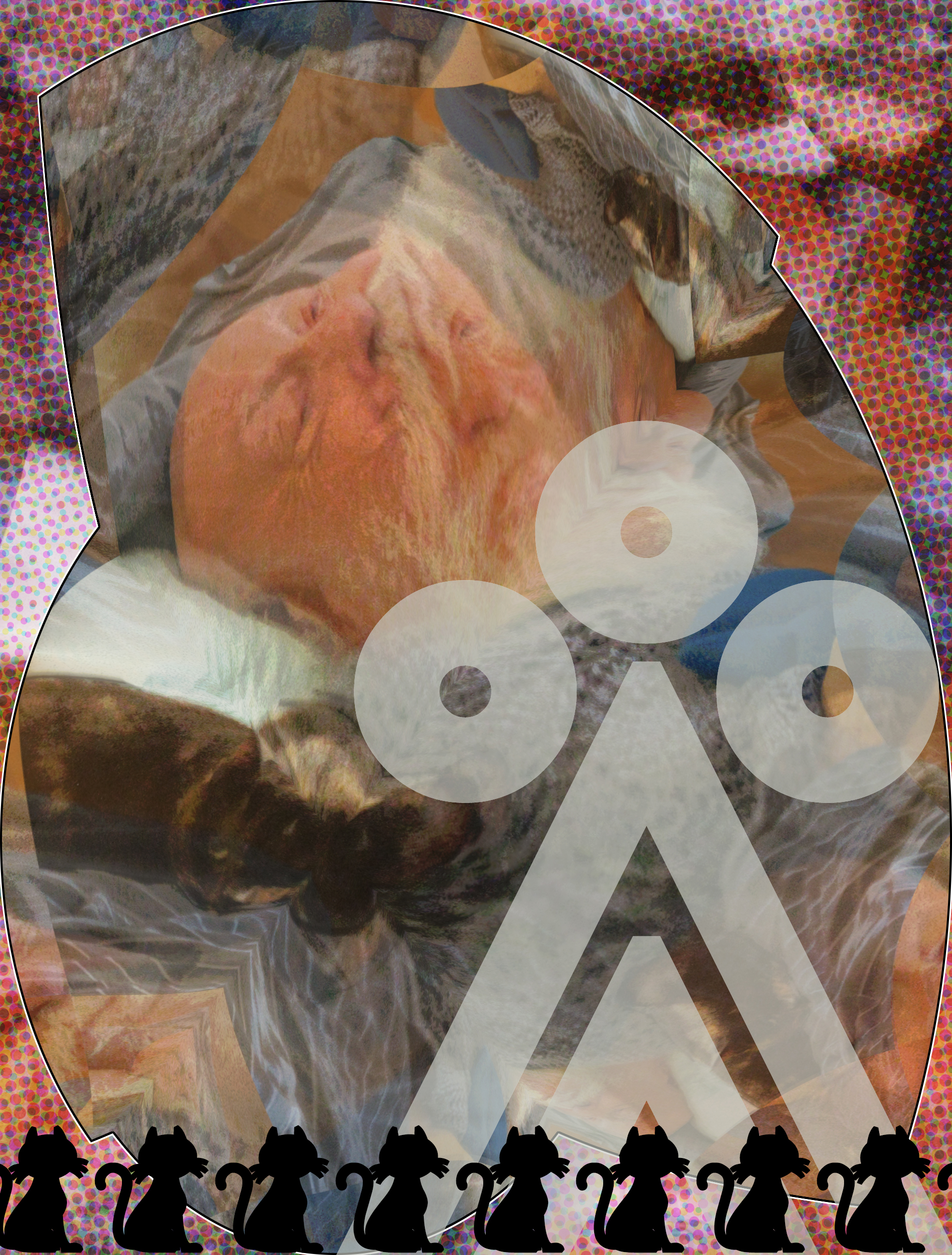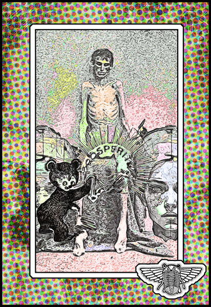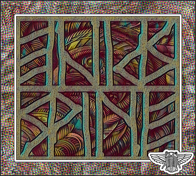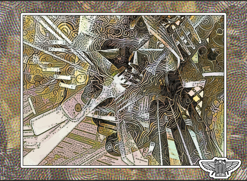.One of the lessons from my show was that my crude alphabetic style from 30 years ago was popular, so I did this piece attempting to combine that stick-alphabet with my image-alteration methods of today. This is the result: the word "SPINE" twice (once upside down), over a nice AI rendering by Armenian artist GlyphWeaver (Link1).