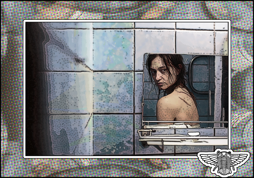 Continuing my exploration of European streaming services, here (from MUBI.COM) is a still from a Ukrainian film "Butterfly Vision" (2022) about a female Ukrainian soldier's return to her family after a prisoner exchange. Here, she takes her first shower after her return and cooly examines the signs of rape and beatings by her Russian captors.