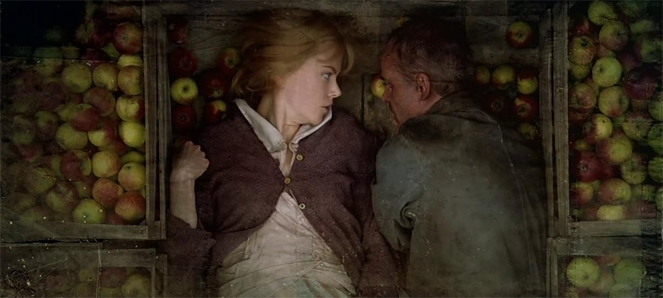 Still from the movie "Dogville," a theatrica film by Danish director Lars Van Trier. A fleeing beauty (Nicole Kidman) seeks shelter in a Depression-era small town, revealing the petty selfishness of its residents. The end: all the residents are murdered by her gangster father and the town is burned to the ground.