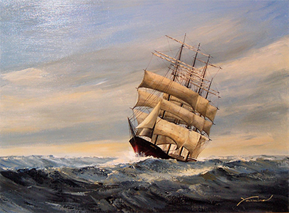 Image is one of the last of the square-riggers, the four-masted German steel-hulled barque "Pamir", first launched in 1904. She was the last commercial sailing ship to round Cape Horn, in 1949. She sank in 1957 carrying a cargo of 3,780 tons of barley from Buenos Aires to Hamburg.