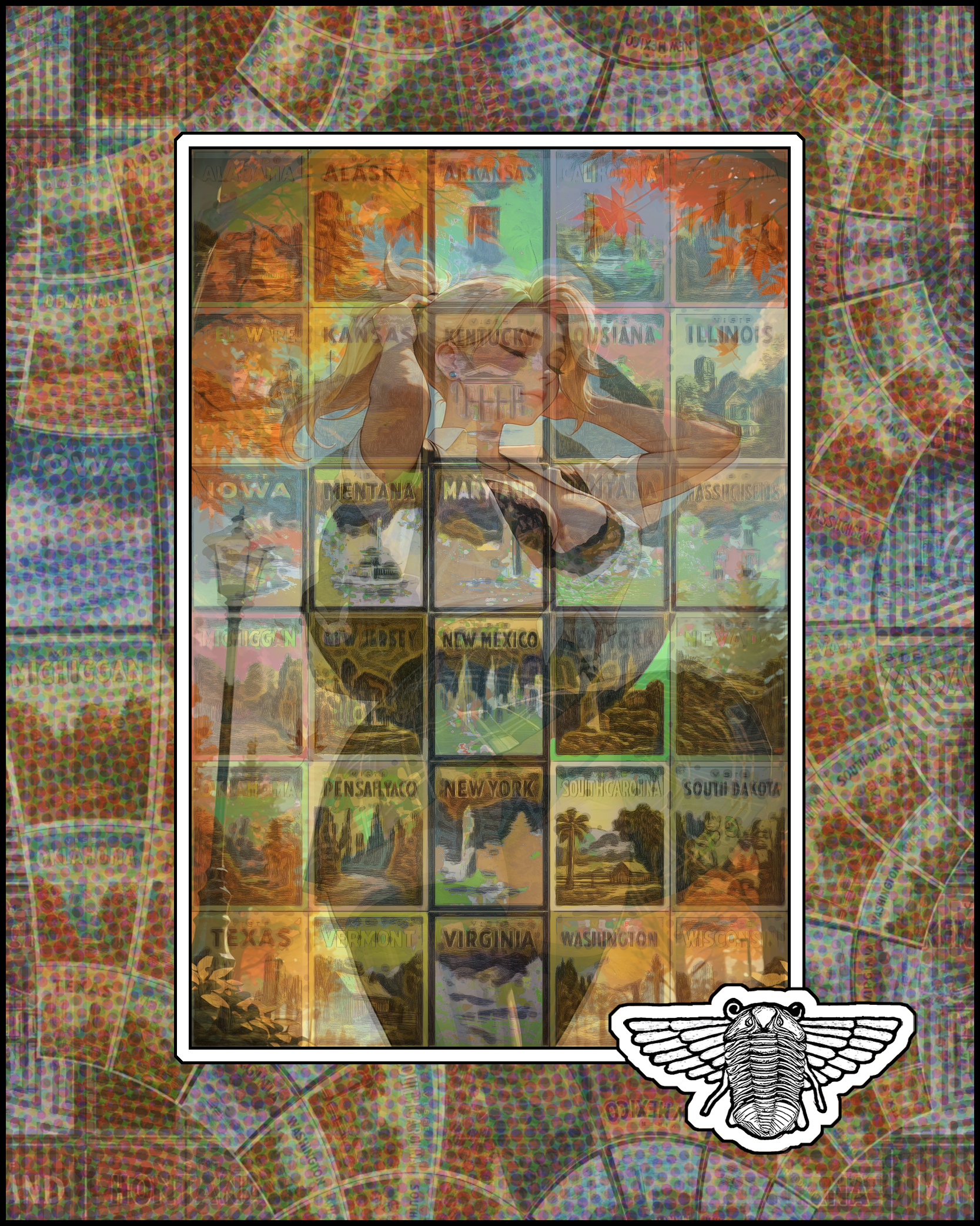 A slick-looking sheet of state stamps, produced by an AI program (Link1), typically flawed, from a Reddit board called "AI Fails," dedicated to AI foul-ups "for reasons such as unrealistic expectations, data issues, and ethical concerns." The image represents my anxiety about the current state of the democratic experiment. Overlaid on the stamps, barely visible, is a leering AI drawing of a girl in school uniform with enormous breasts and a plaid skirt lifted by a Fall breeze to show her underwear. (Link2). It was uploaded to 4Chan and it represents my recognition of the horny frat-boy mentality apparent in today's right wing.