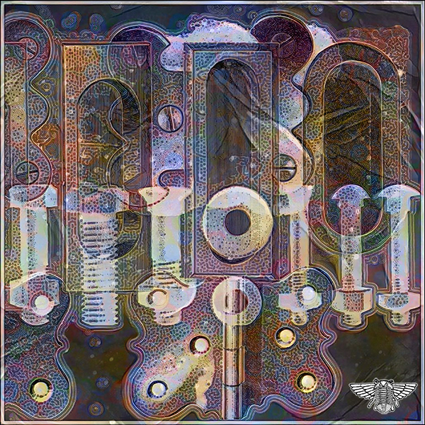 A second take at combining some images from the 1923 "Condensed Catalogues Of Mechanical Equipment" (Link1) by The American Society of Mechanical Engineers. Elements of the collage include hinges, screw and bolt fasteners, and flush pulls.