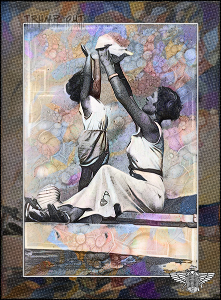 Images are from the covers of old basketball programs; in the foreground, a 1944 Iowa v. Iowa State program (Link1), in the background a 1948 Kansas v. Colorado program (Link2).