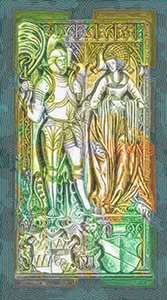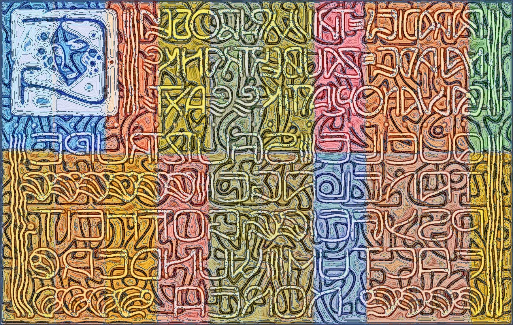 Background is another rearrangement of paint samples from the 1948 Plochere Color System. Elements in the foreground are the characters P..V of a fictional alphabet from the role playing game The Elder Scrolls, set to type by the prolific typographer Neale Davison, pen name Pixel Sagas.
