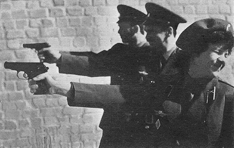 From a 1937 propaganda magazine by the German Ministry of War, Wehrmacht (Link1), a photograph alleged to show Russian workers preparing chemical warfare agents. Superimposed on that is a drawing of a cabinet door latch, from a 1955 catalog of National builders hardware (Link2).