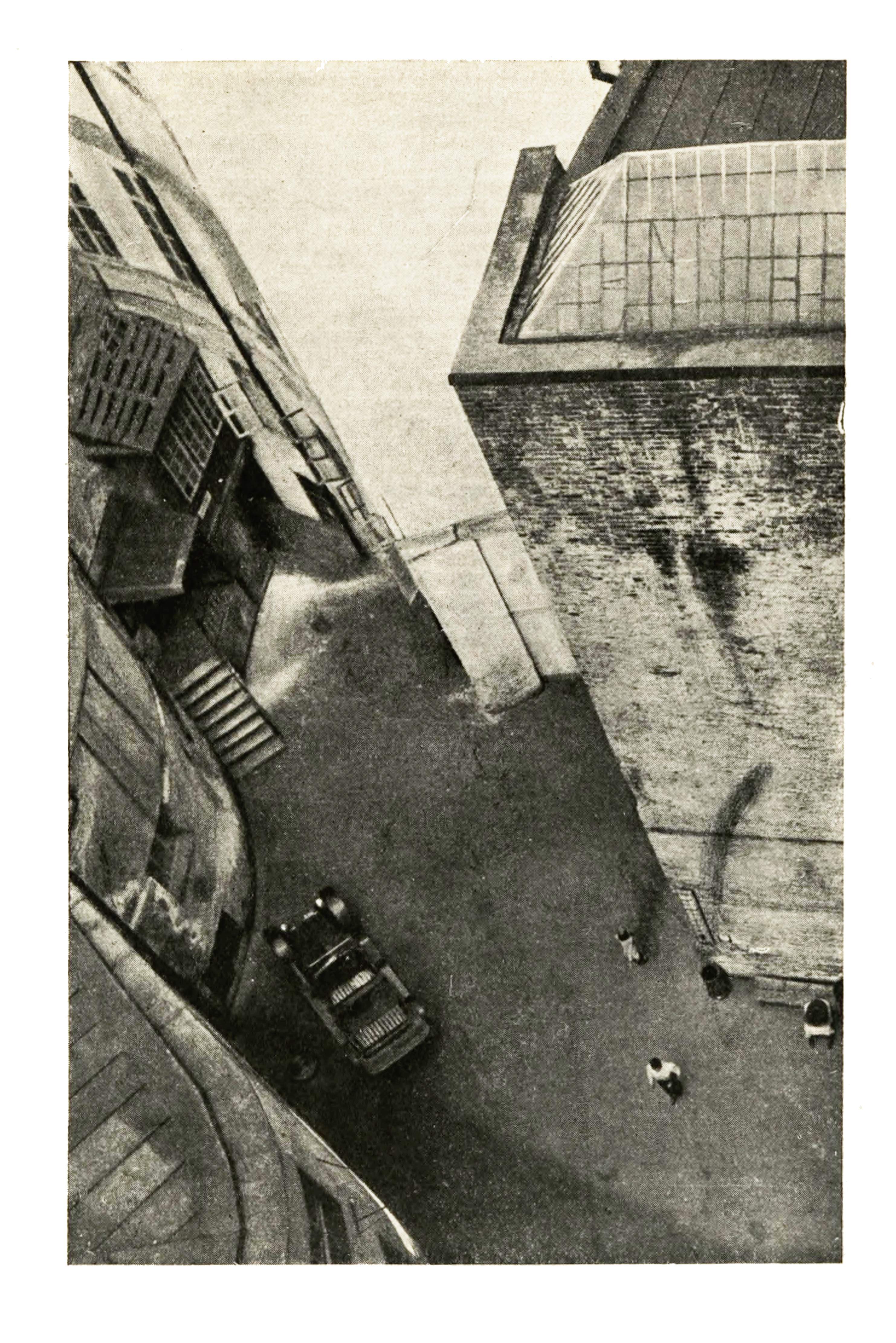 From a 1929 issue of The American Cinematographer (Link1), two hand-sketches illustrating a cinematic effect for a single scene in the short silent horror movie, The Fall of the House of Usher (Link2), based on the Edgar Allen Poe story. In the top rectangle, at the beginning of the scene, a woman runs down some stairs against painted scenery. The scene continues, dissolving, in the bottom rectangle, into a closeup of the woman and the stairs.