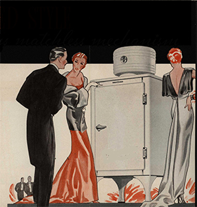An illustration of fashionable folks in evening dress admiring a refrigerator from a 1935 brochure General Electric presents a new deluxe monitor top refrigerator (Link1) (The name "Monitor-top" is a reference to the cylinder atop the refrigerator, like the cyclindrical cannon turrets of the Civil War vessel, U.S.S. Monitor.)