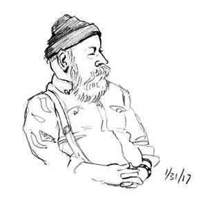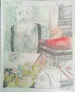 "Those 20-minute stretches of silent stillness was the closest I ever come to meditation. Given my pathetic compulsion to "do" things with my time, I figured out that it was a good chance to practice my Roman Room memory techniques to write stanzas of poetry. First day, I wrote a poem called "Hollow Tube." Second day, I wrote notes on the childhood cottage that I use as my Roman Room. Ended up the second session in deep depression, remembering that cottage and realizing that my relative social and economic status and financial security has declined from that of my parents at the equivalent age."Acquiring another portrait, I traded a piece of my work with a visiting artist from Toronto, Meri Collier, who did this sketch of me (titled "Bob's Your Uncle") during a Thursday morning open workshop in April 2016.