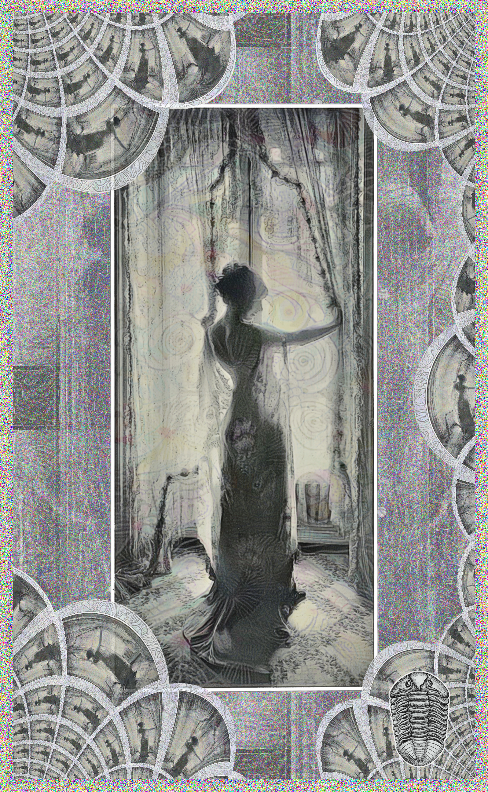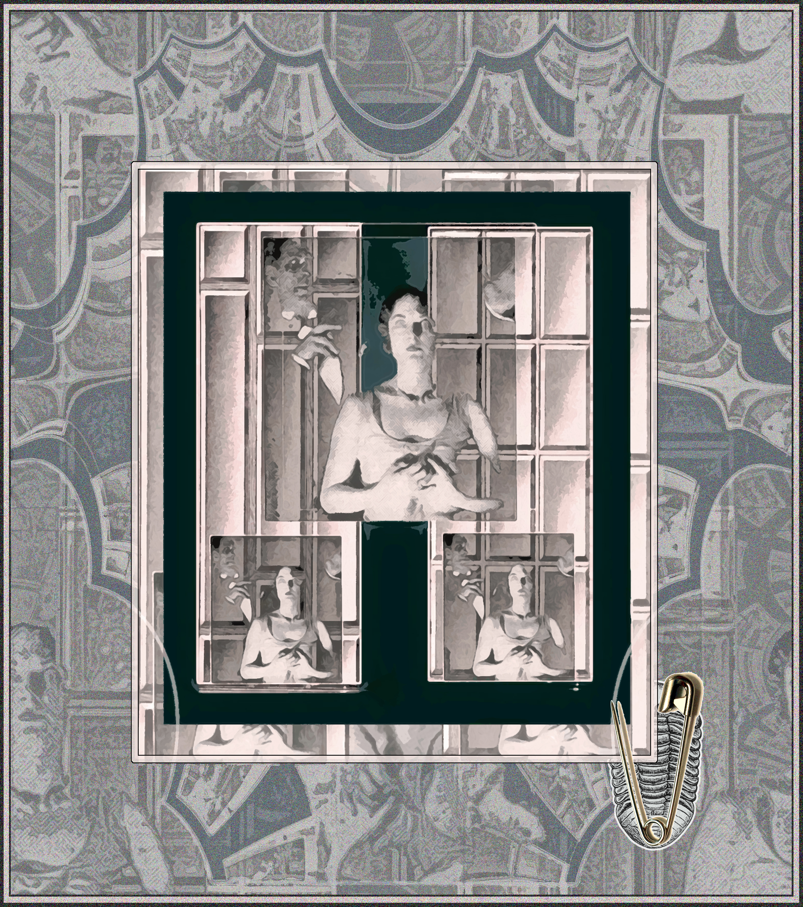 A photograph of a woman in evening dress being hypnotized by a man in a tuxedo from a June, 1930 issue of True Detective Mysteries (Link1). The image appears in an ad with the headline "You Can Learn Hypnotism in Five Days ... or No Cost." Her image is superimposed (three times) on a collage of window panels from two wooden front doors, taken from the 1924 catalog of McMillen Millwork (Link2).