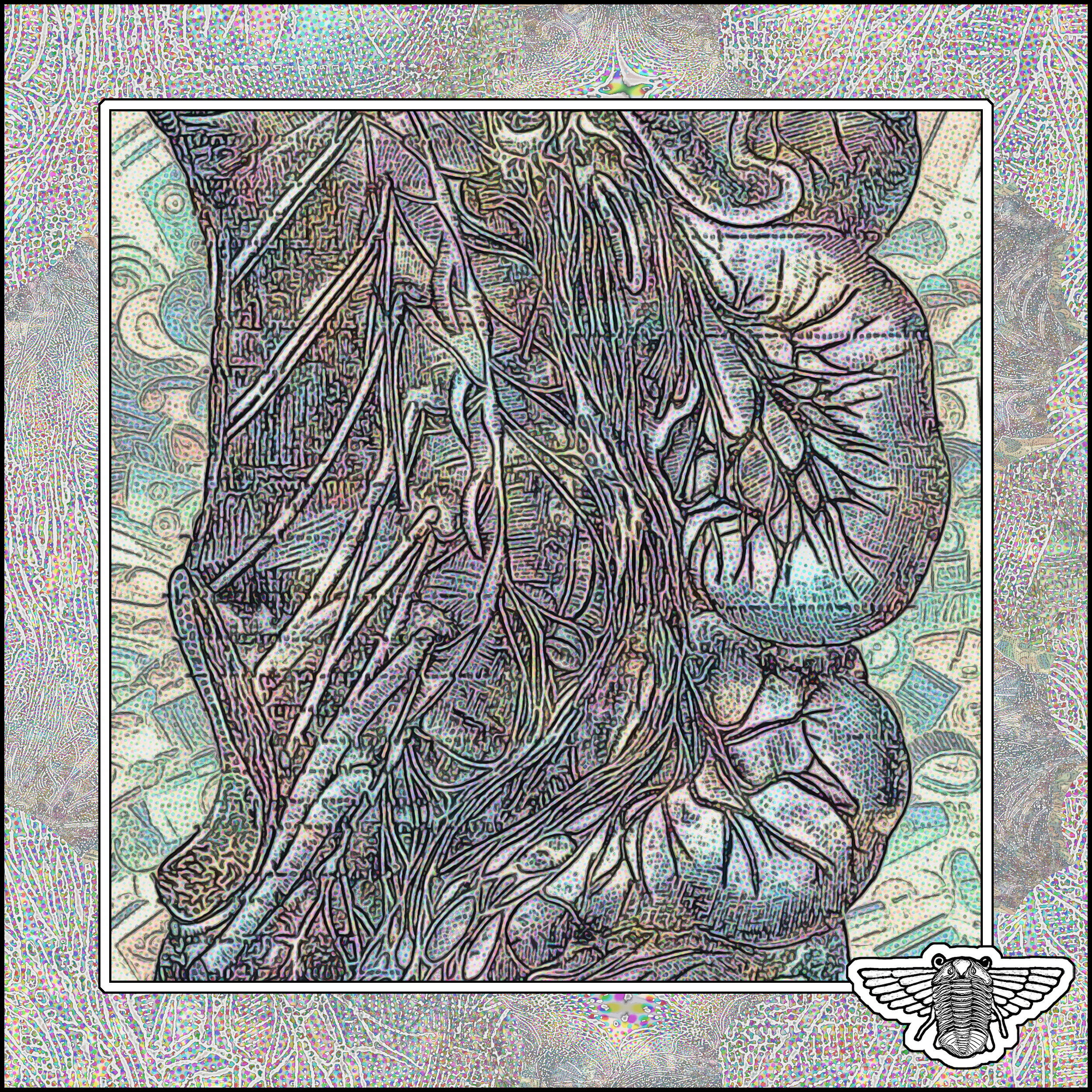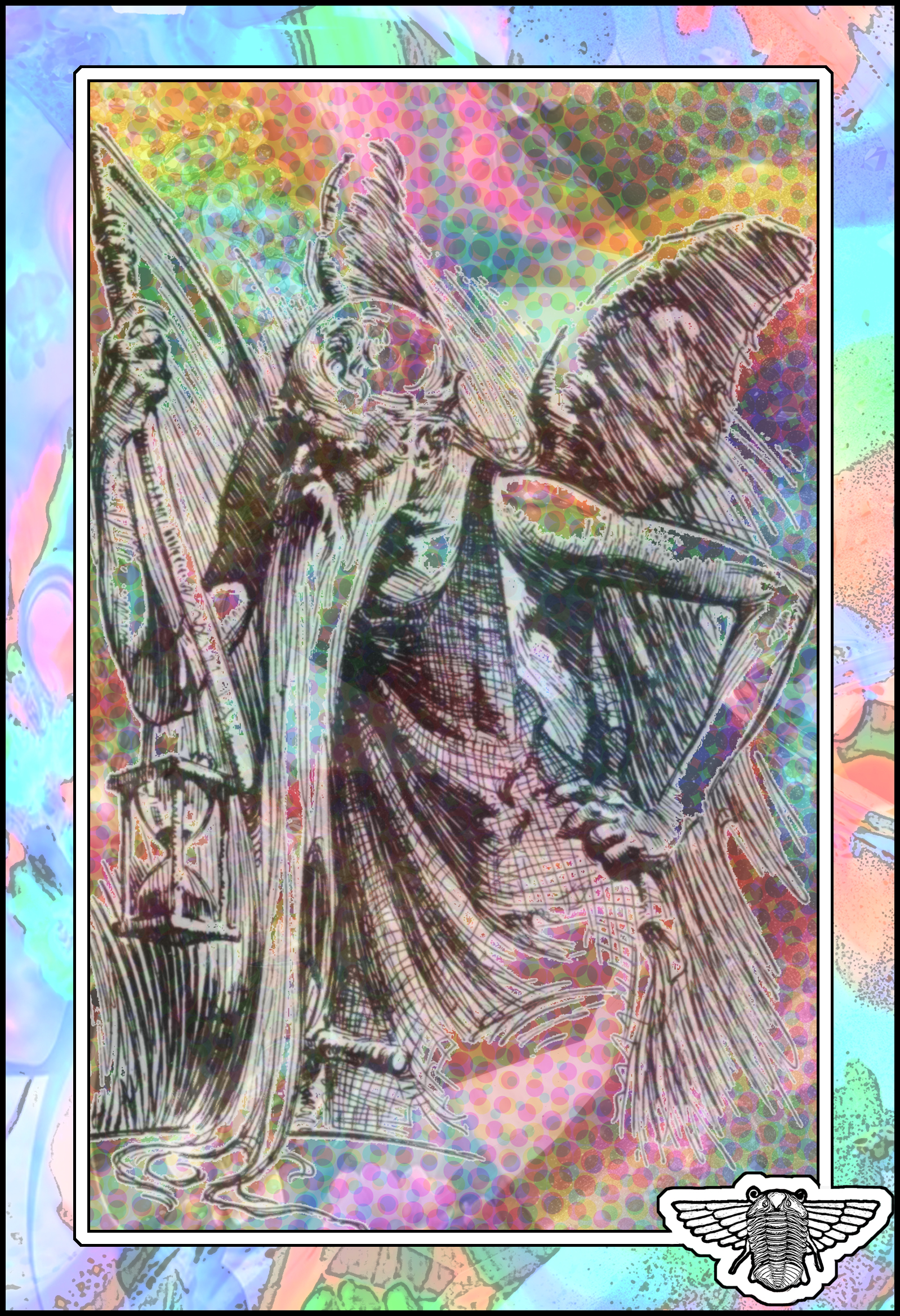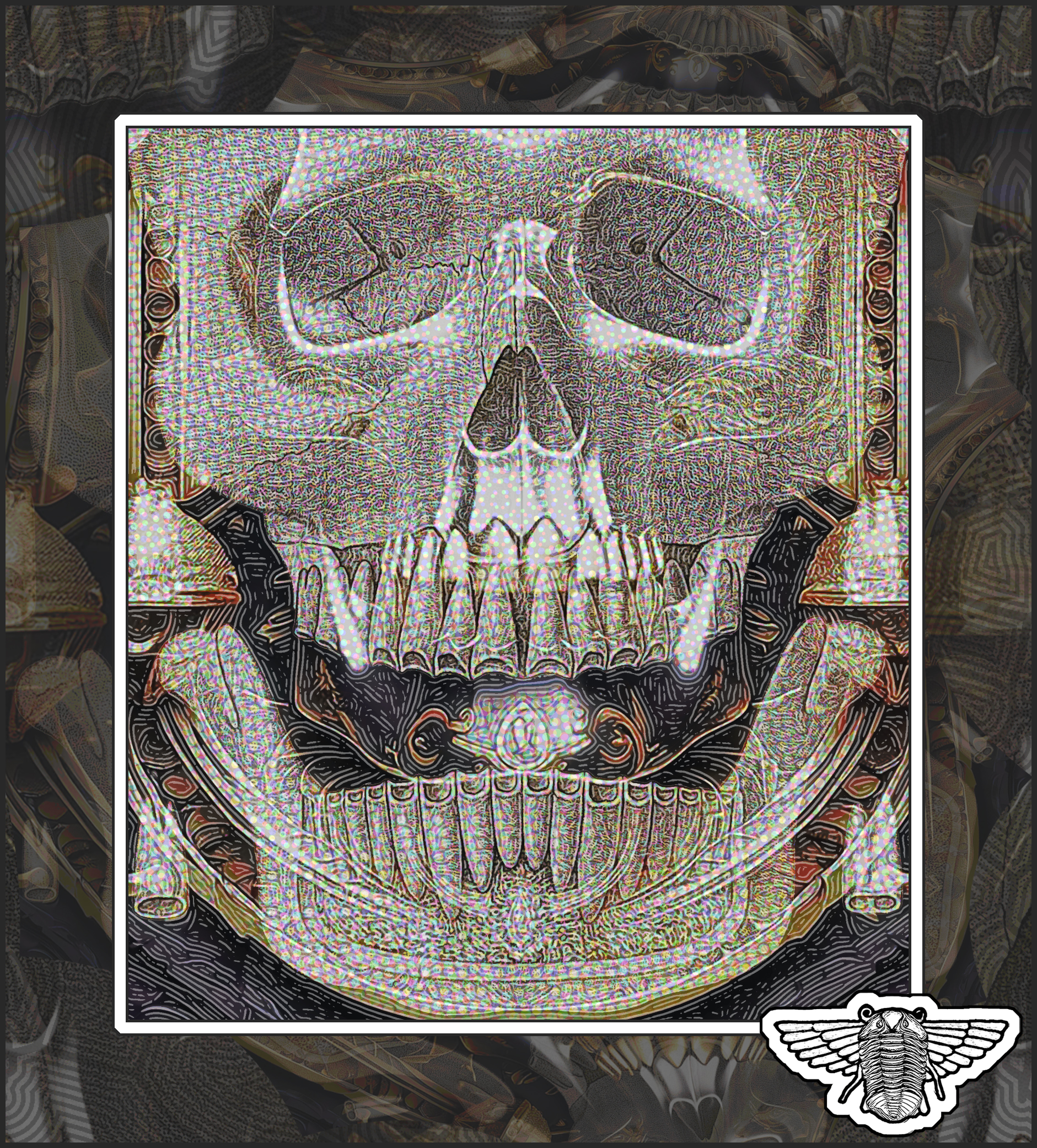 Text, composition, framing, surface texture, coloring, and winged-trilobite logo by Bob Moore