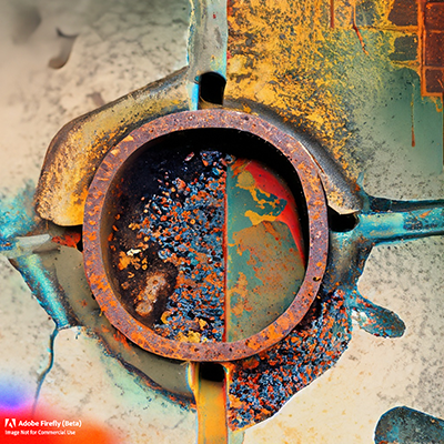 The photo is centered on an AI-Generated image, from Bing, in response to the prompt "ornate pattern based on automobile engine in black and white" (Link2).