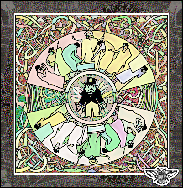 A composition of (1) a Greek vase illustration, (2) an AI-generated pattern, and (3) the old Monopoly moneybags man -- but with empty pockets