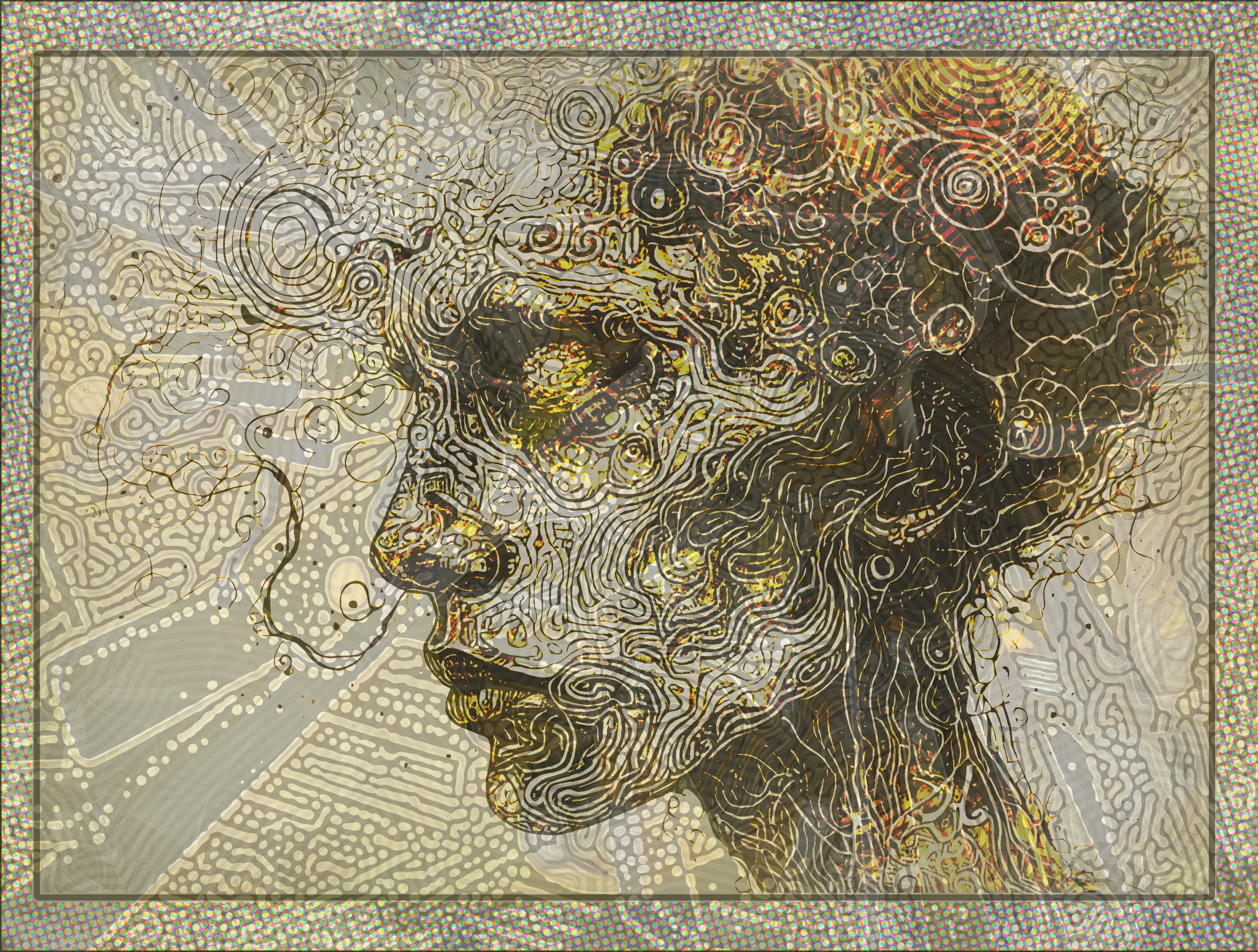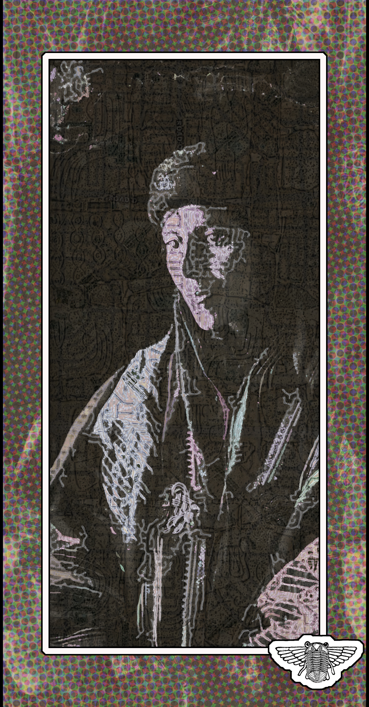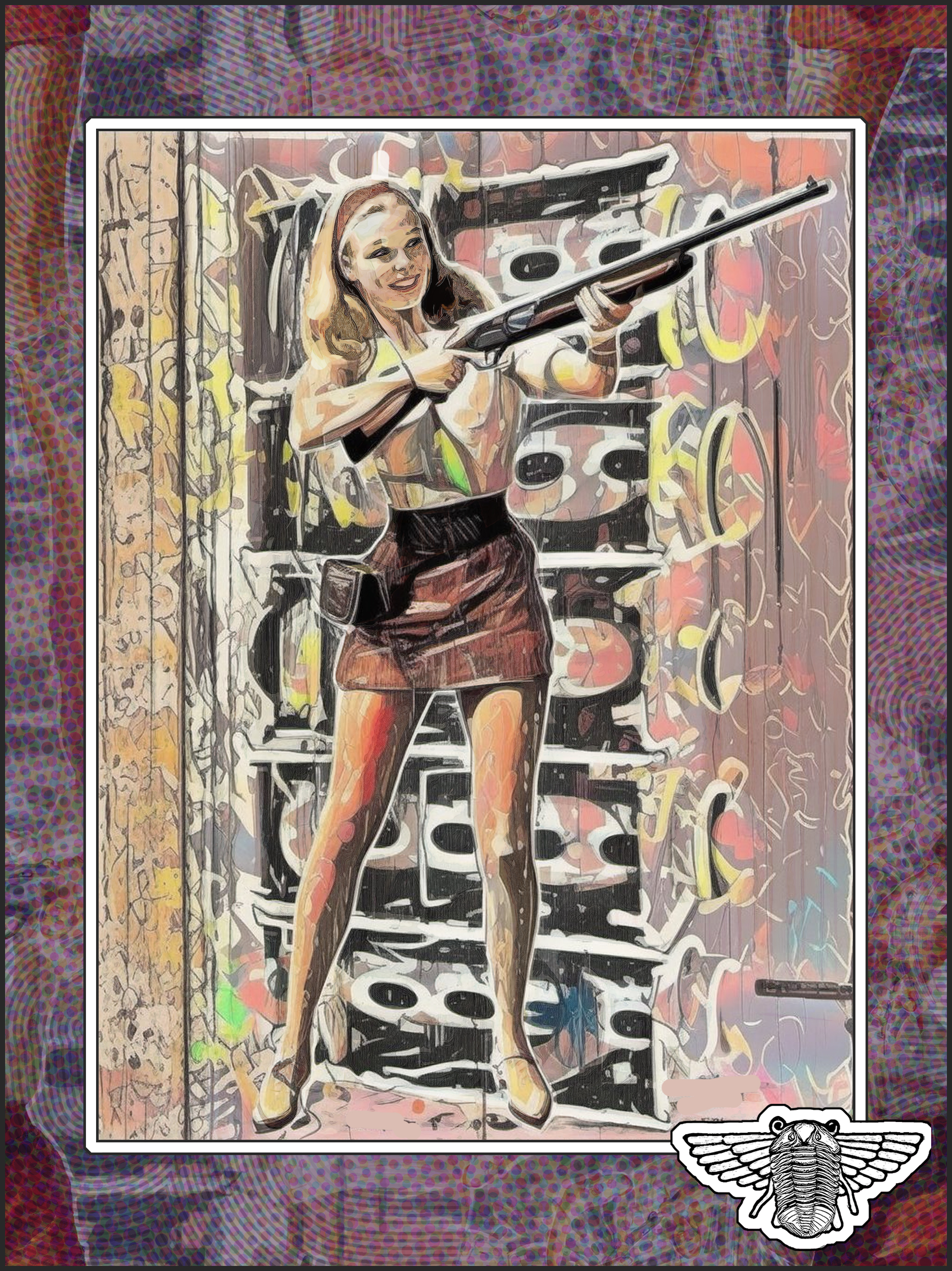 From a 70's nostalgia site, a teenage girl at a skeet shooting range (Link1) overlaid on a photograph of an old conductor's belt-style changer holder (Link2). The whole goes through my usual distortion and composition procedure (Link3), and then, finally, a touch of NEURALSTYLE.ART transfer, style GRAFFITI (Link4).