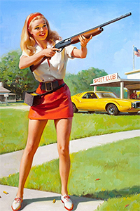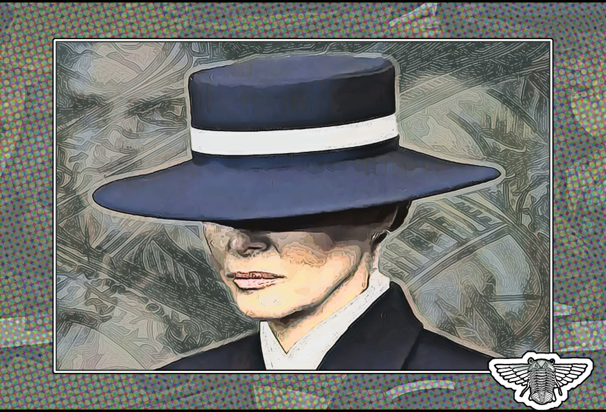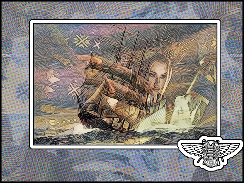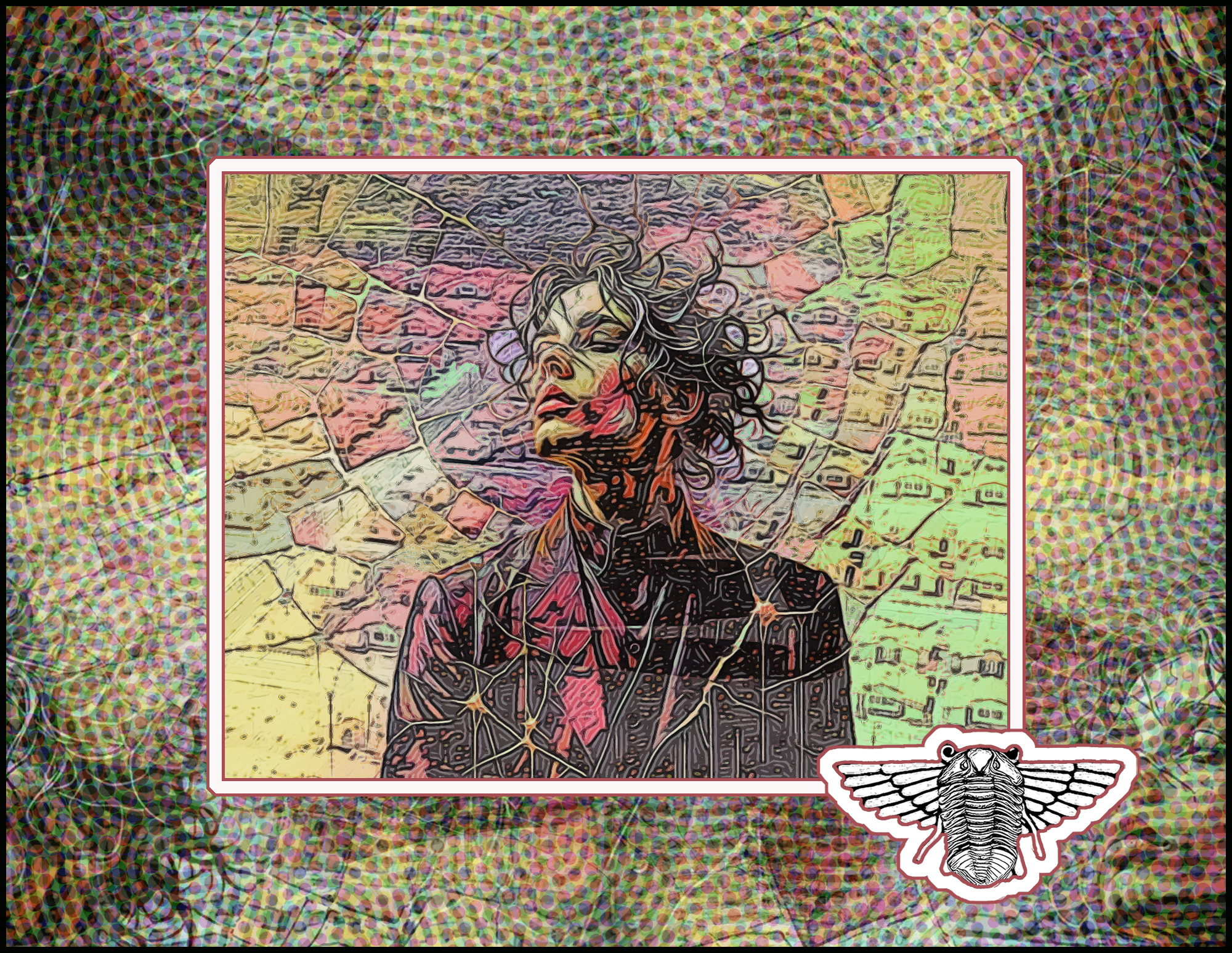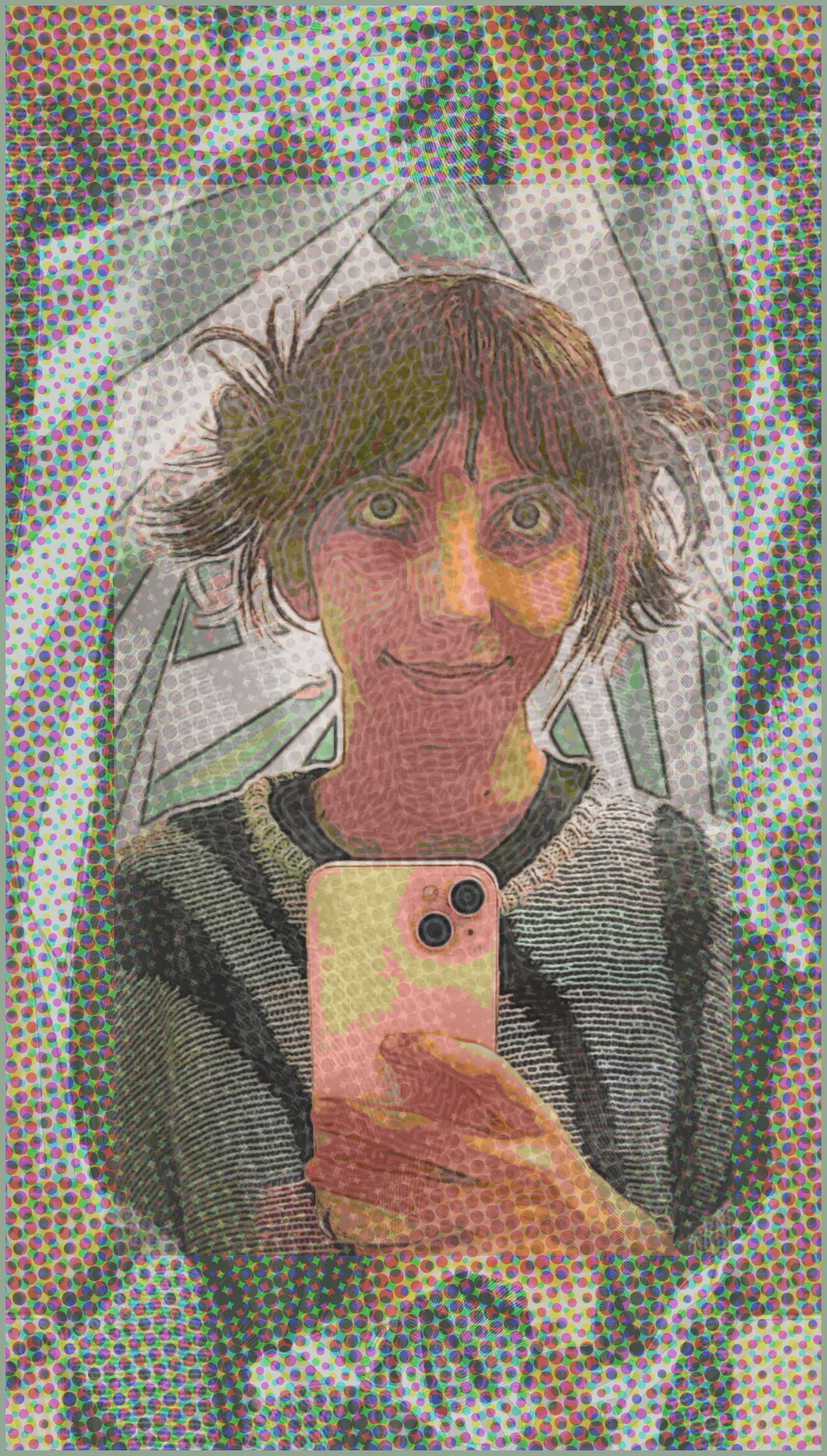 From a 70's nostalgia site, a teenage girl at a skeet shooting range (Link1) overlaid on a photograph of an old conductor's belt-style changer holder (Link2). The whole goes through my usual distortion and composition procedure (Link3), and then, finally, a touch of NEURALSTYLE.ART transfer, style GRAFFITI (Link4).