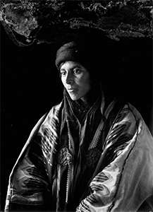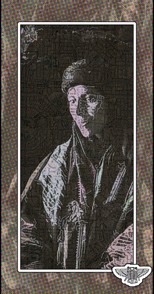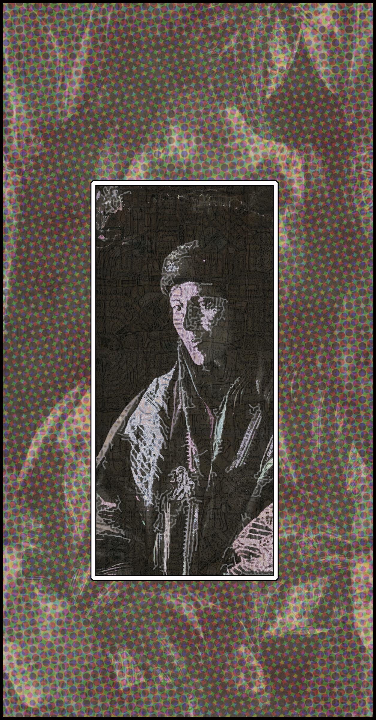 A Bedouin bride from a 19th century photograph (Link1). Texture and complexity are added by two background images. First, a map of a modern Kuwaiti suburb which is growing up at the site of the infamous "Highway of Death" during the Iraq war (Link2). Next, a photograph of carvings from a 3000-year-old temple in Peru depicting human sacrifice (Link3).