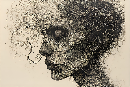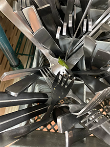 A monochrome head (Link1) I paid $5 to download from DeviantArt's "AI Art" section by EvanescenceAphrodite. It is superimposed on a picture of forks (Link2) loaded into a dishwasher at a restaurant at closing time, in Reddit board "ServerLife" by TooWorried562.