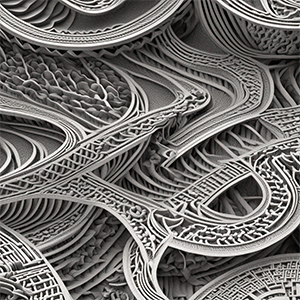 .One of the lessons from my show was that my crude alphabetic style from 30 years ago was popular, so I did this piece attempting to combine that stick-alphabet with my image-alteration methods of today. This is the result: the word "SPINE" twice (once upside down), over a nice AI rendering by Armenian artist GlyphWeaver (Link1).