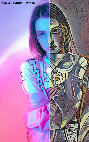 Used the neuralstyle.art digital filter on this, very diluted. Below: first, the original publicity photo; then the direct result of the filter. The style I used was called "Nubiola Portrait Miro" (left image), apparently based on this 1917 painting (right image) by Spanish artist Joan Miro.